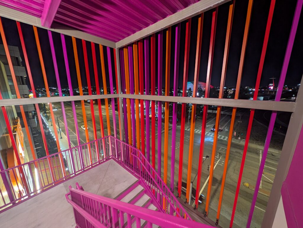 Another consideration was the weight of the logo that hangs across the battens, welcoming visitors to the OC Vibe parking structure. Jeff shares, “the letter O alone, was about 400 pounds.” With this in mind, the product needed to be sturdy to be installed to the structure, hold the weight, allow the battens to extend beyond the cantilever, and have flexibility with the movement of the concrete slabs. With a lot of conversation, redrawing, and testing, these were all challenges that AMS and Longboard were able to resolve.