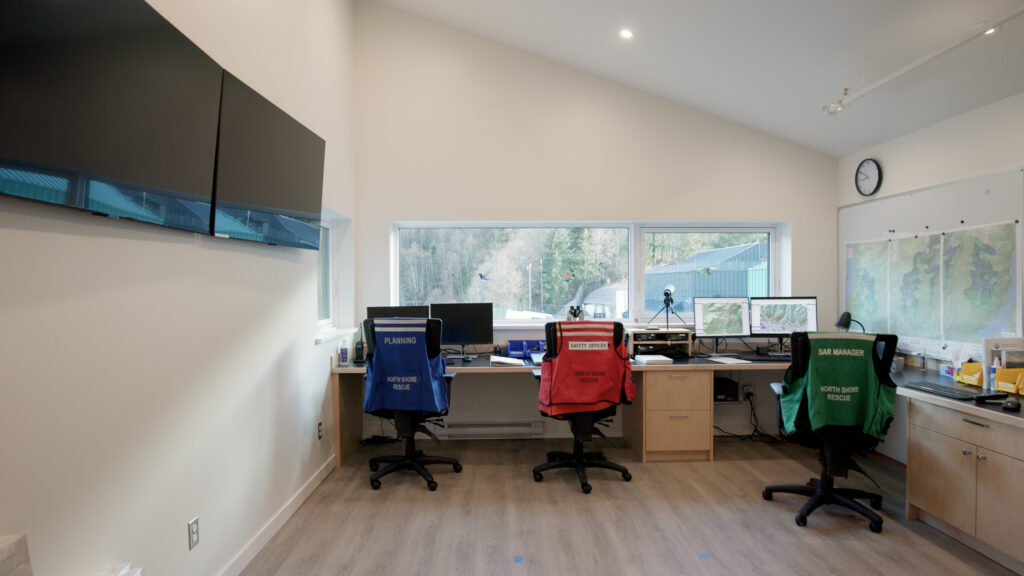 “We offer search and rescue services for any of the outdoor recreationalists on the North Shore Mountains,” explains Allan McMordie, Search Manager of the North Shore Rescue. Allan has over 46 years of experience at this facility. When reflecting on his experience with the previous structures and how he feels about the upgraded center, he says, “It was difficult in the old seacan where you only had one room. A lot of the team members would come in after their search to let you know what they did, or at the beginning of the search to let us know they’re available, and there’s a lot of noise, a lot of commotion. There are people getting gear out of the shelves, and you’re trying to communicate on the radios to people out in the field. By separating those things, we have a dedicated command area with the radios, and then we have this area where all of the gear is and where people can collect and talk about the search, get their teams together, check gear, without having to interfere with what’s happening in the command centre.”