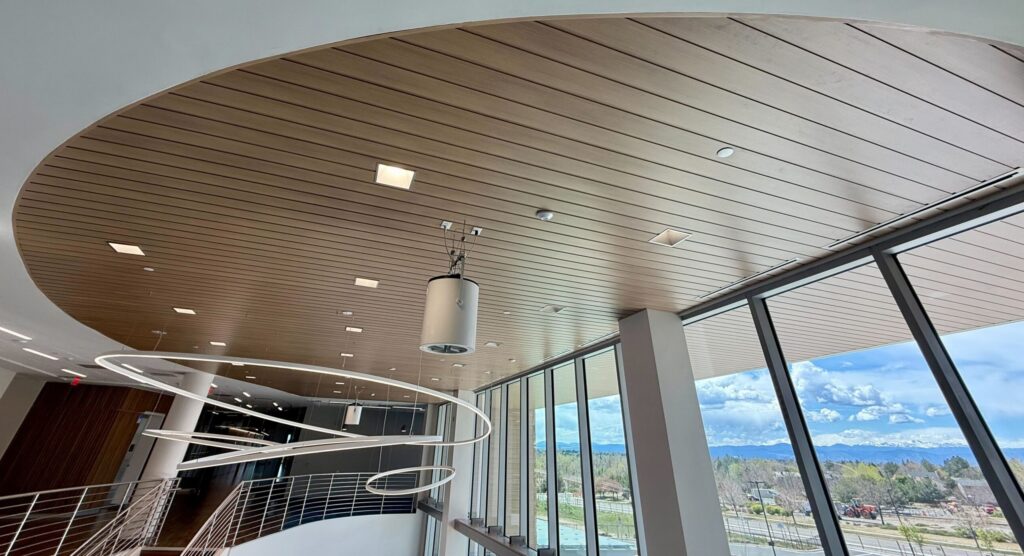 At the Galen College of Nursing in Colorado, the challenge was indoors. A sweeping elliptical ceiling clad in Tongue & Groove 6″ Channel planks with a warm Rock Elm finish anchors the building’s main interior space. Finishing the perimeter of that ellipse, where the wood-toned planks terminate against the surrounding white ceiling, required a trim that could follow the continuous curve without a single interruption. Non-tempered trims bent smoothly along the full arc, delivering a clean, unbroken edge that gives the space a calm and polished quality.