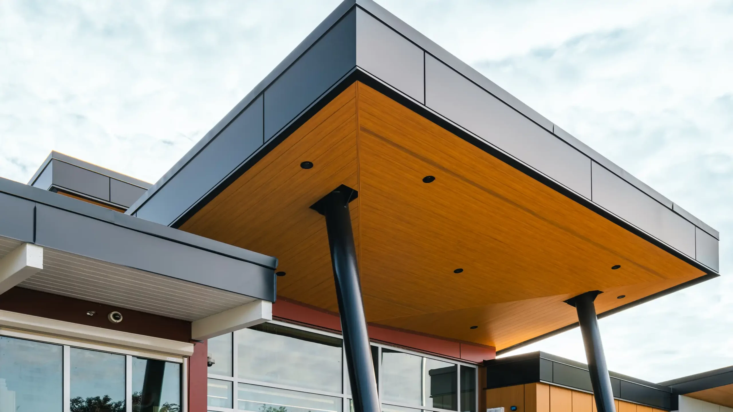Whole Foods, 6″ V-Groove Planks & 1×5″ Privacy Beam for Soffit / Cladding in Light Cherry