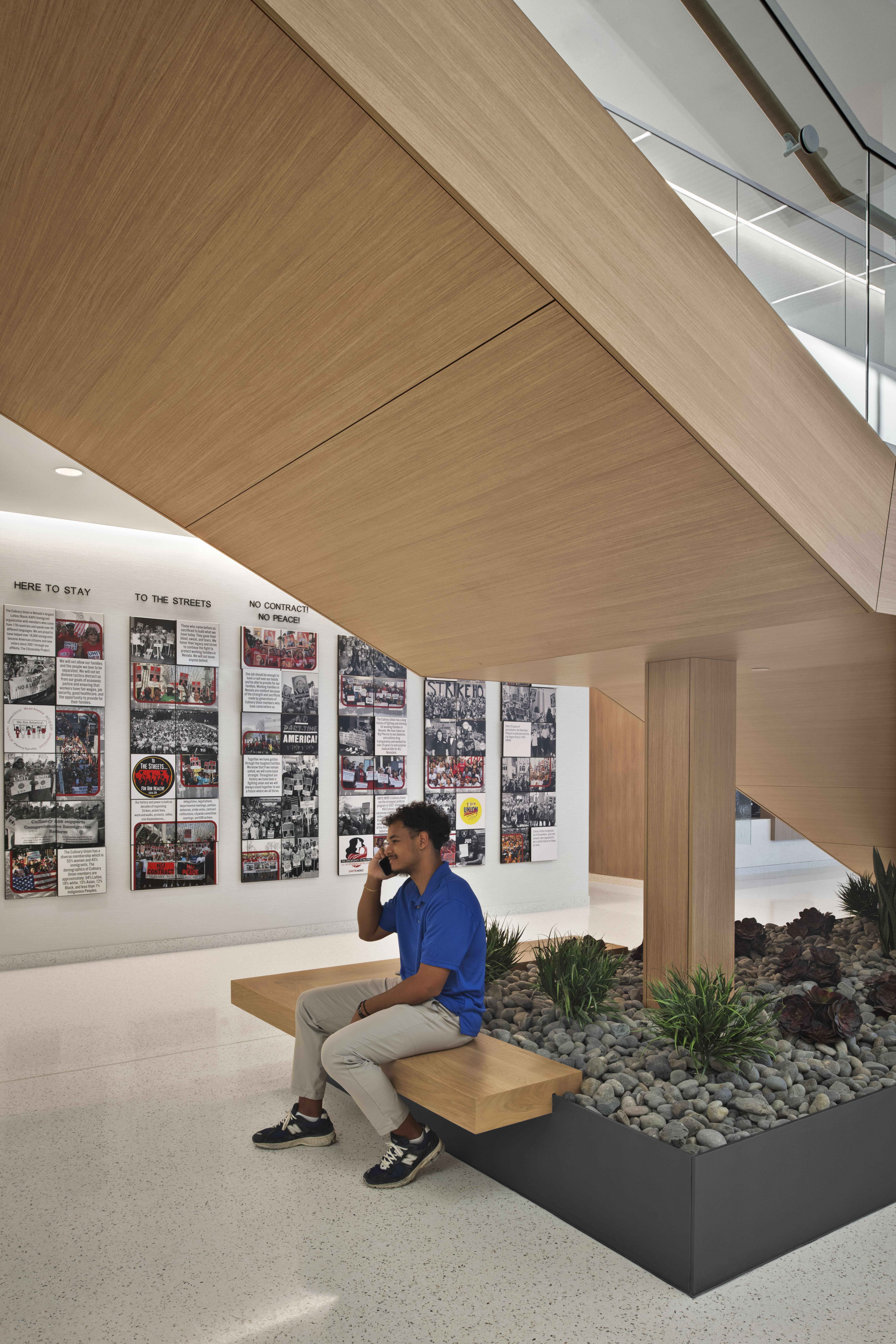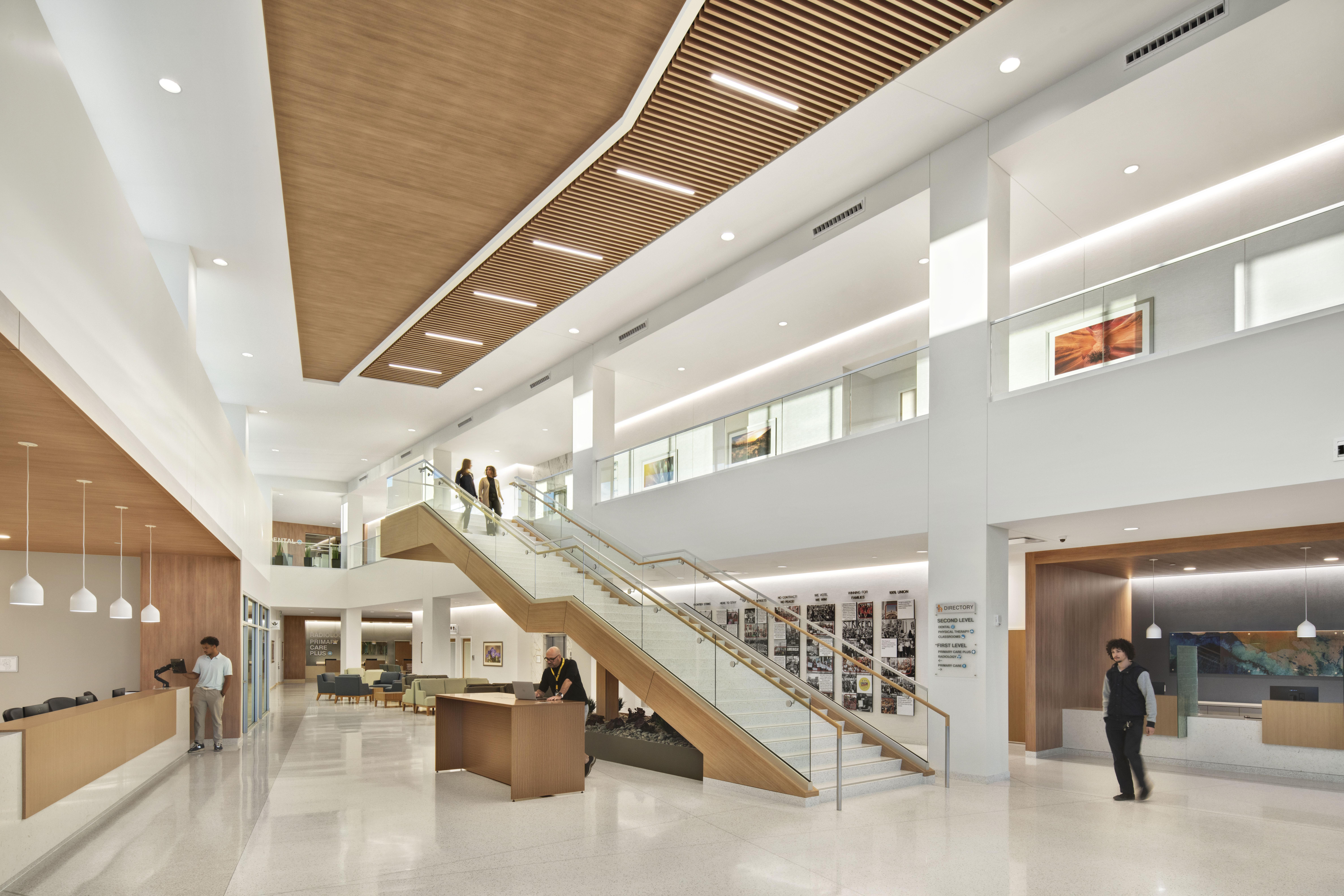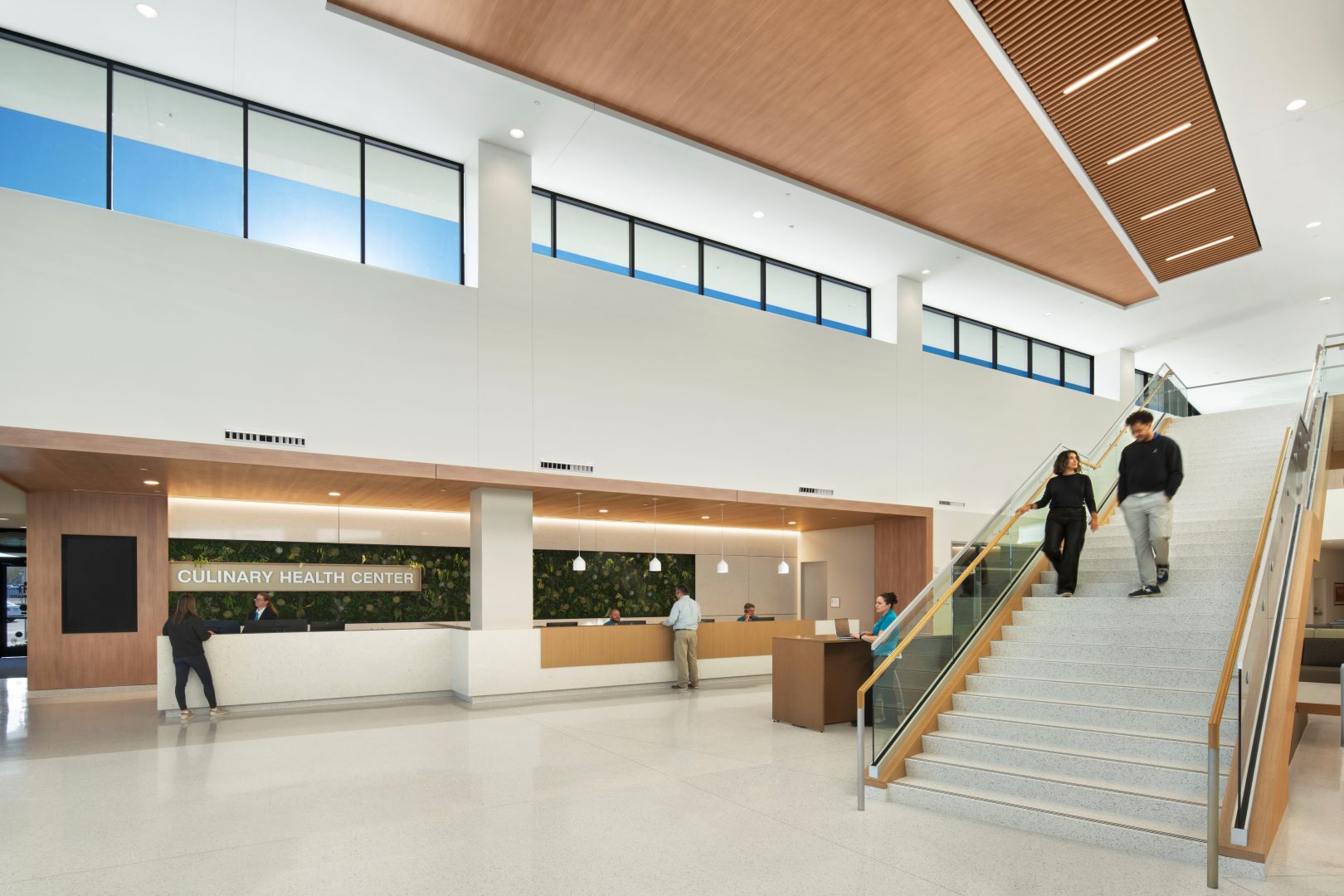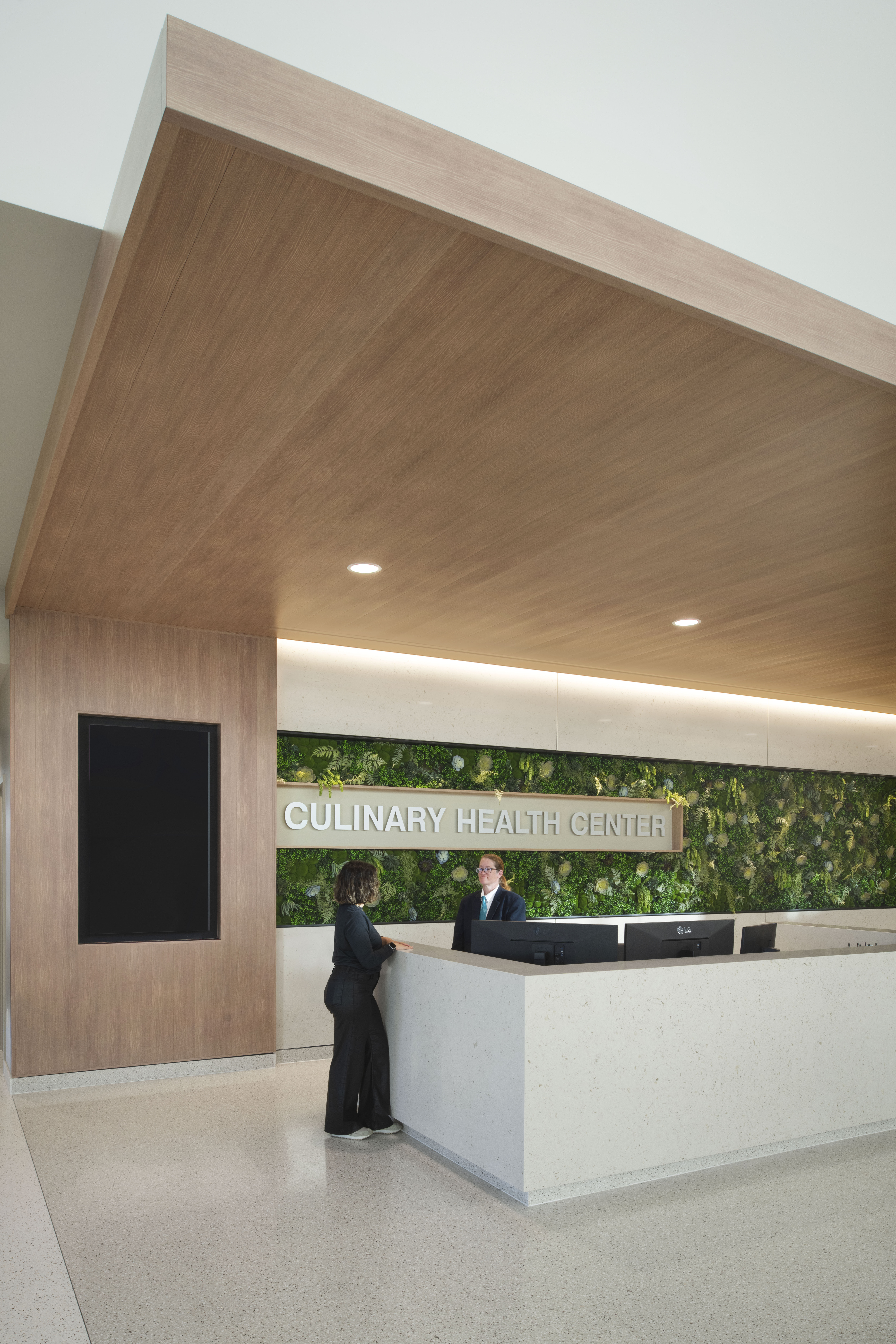 The Culinary Health Fund facility in Las Vegas, Nevada, incorporates Longboard’s T&G Planks in a 6″ Smooth profile alongside 1×4 Link & Lock systems throughout its interior spaces, creating a clean, contemporary atmosphere that supports wellness and professionalism. The combination of smooth finishes and precise architectural lines adds warmth, texture, and visual interest while maintaining the durability and low maintenance essential for high-traffic healthcare environments