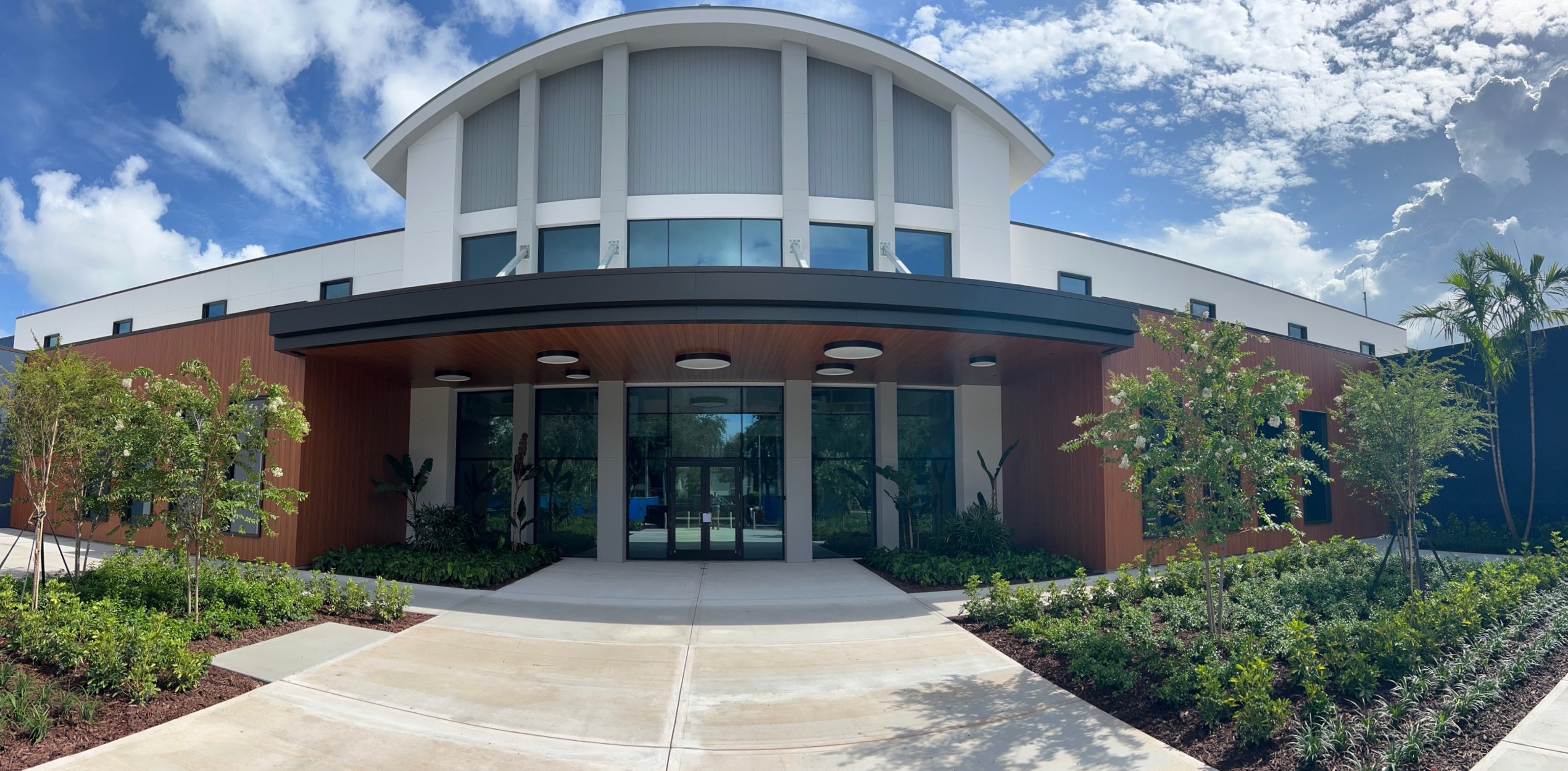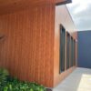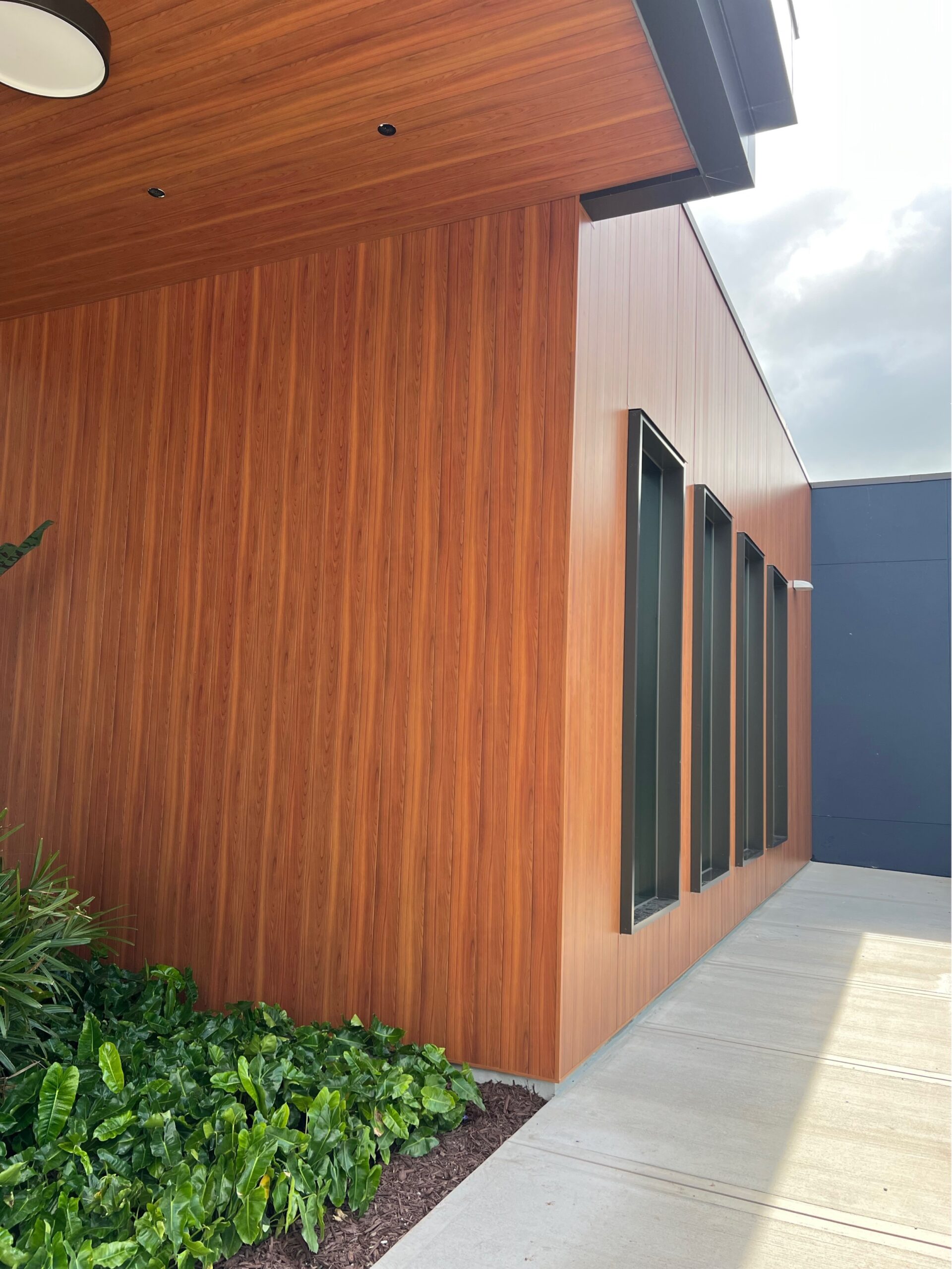 Longboard aluminum panels were used at the entrance soffits and fascia to define a clear sense of arrival. Their linear warmth adds depth and contrast, framing the windows and overhead lighting so they stand out and visually pop, while reinforcing a clean, modern façade.