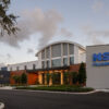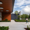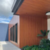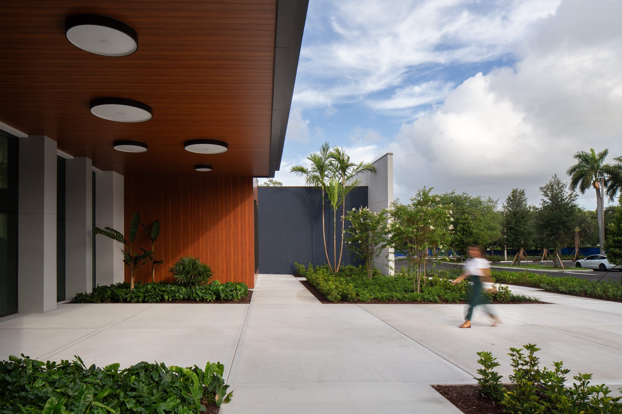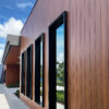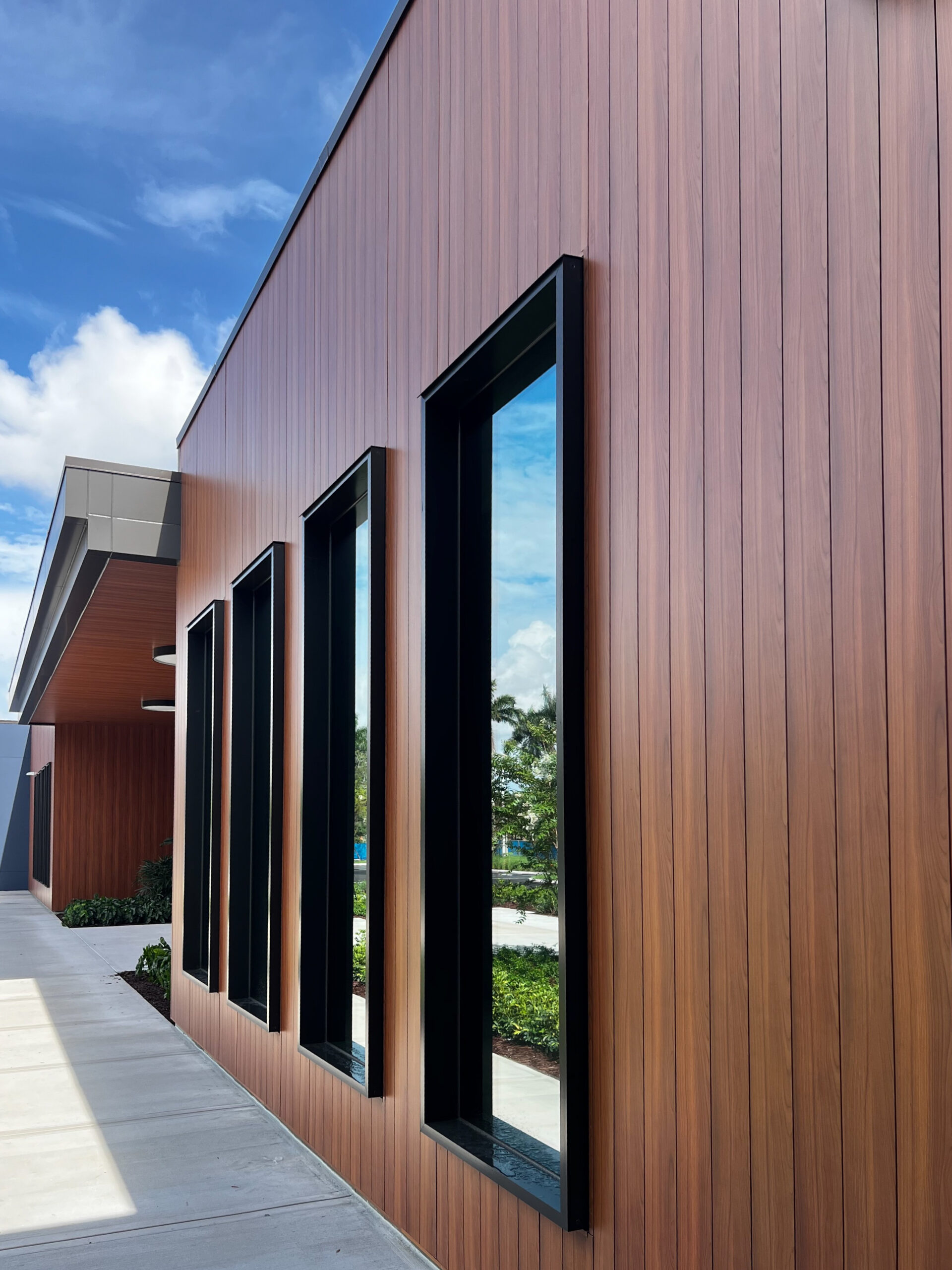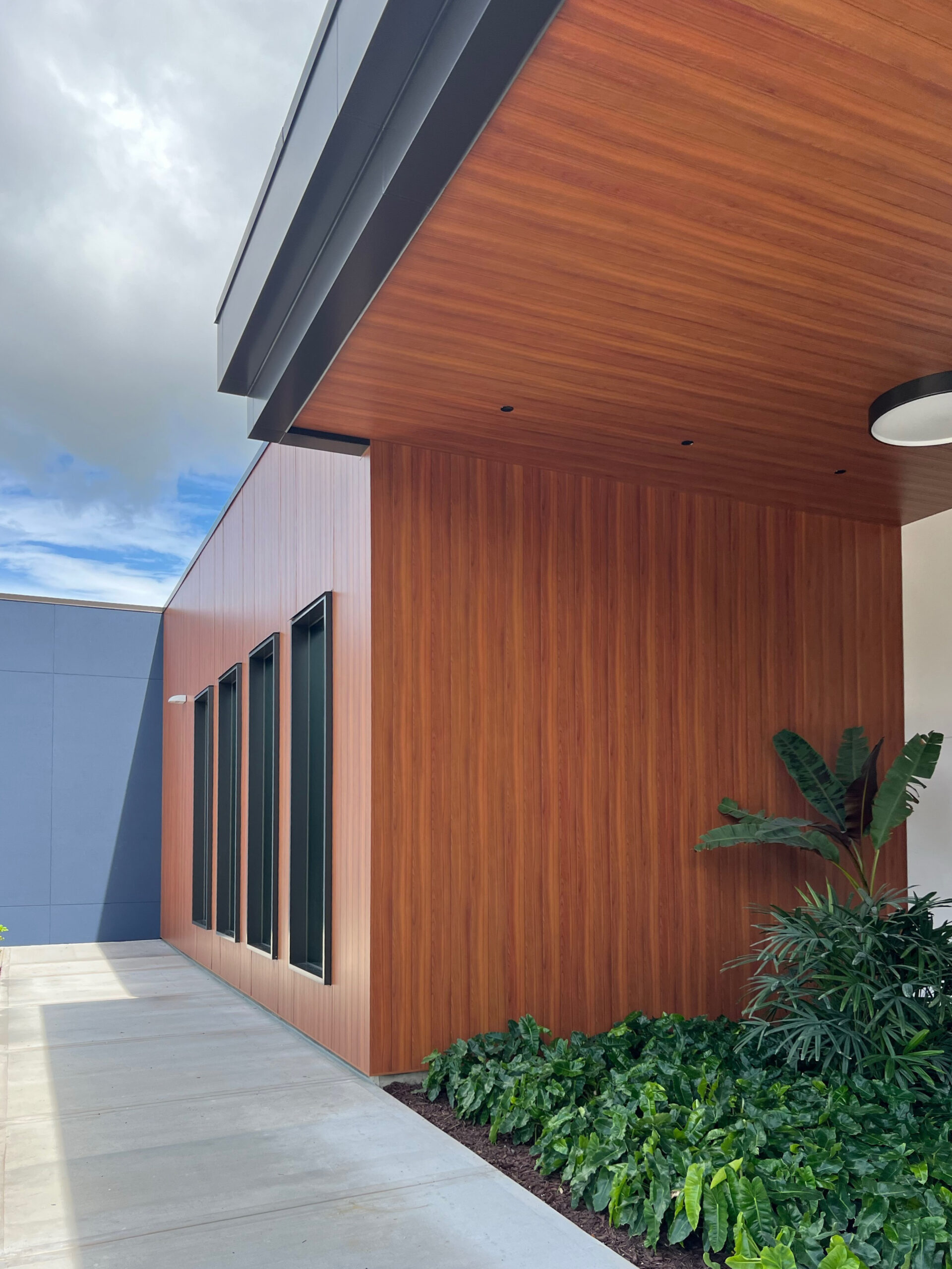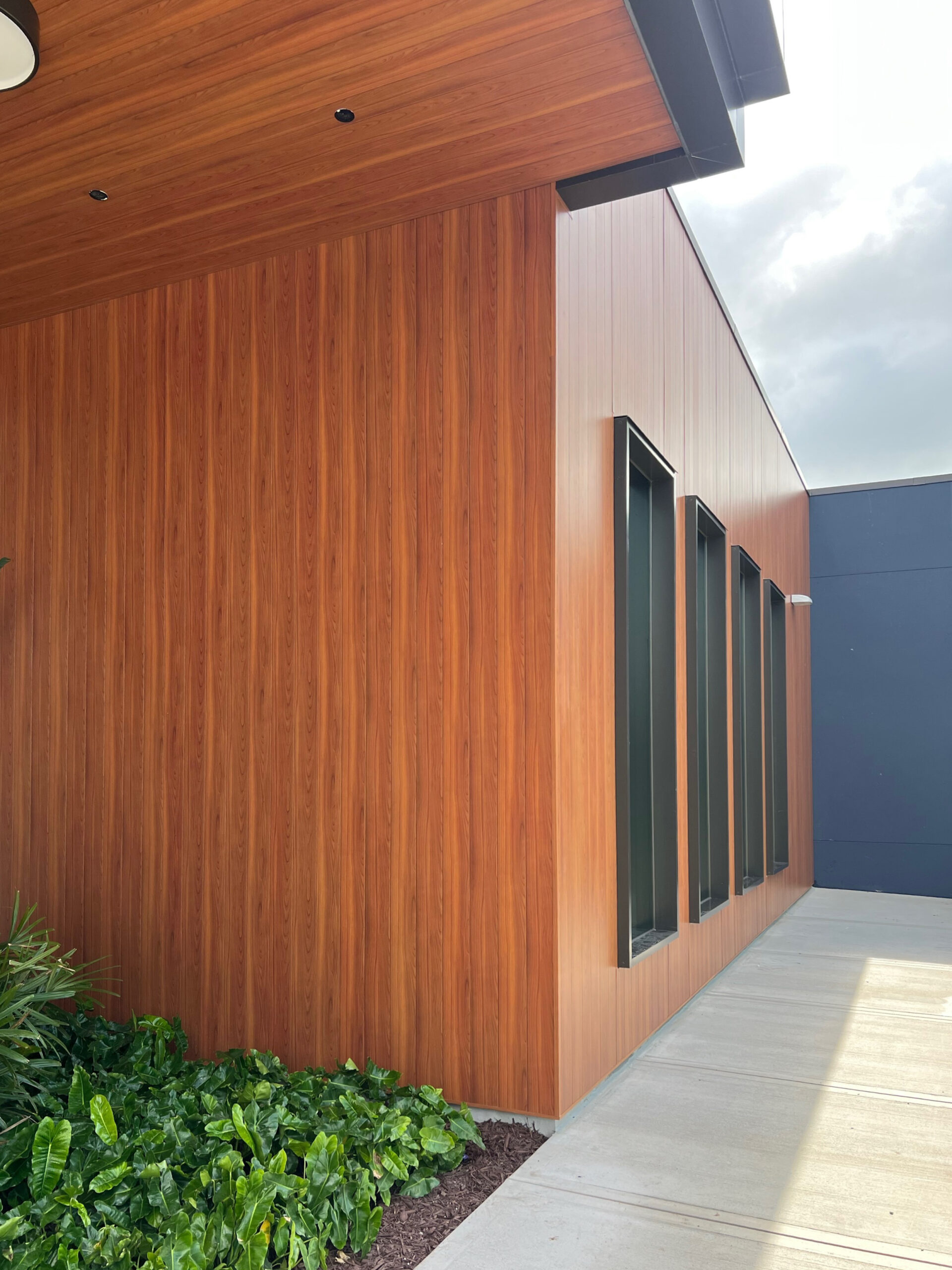 Longboard aluminum panels were used at the entrance soffits and fascia to define a clear sense of arrival. Their linear warmth adds depth and contrast, framing the windows and overhead lighting so they stand out and visually pop, while reinforcing a clean, modern façade.
