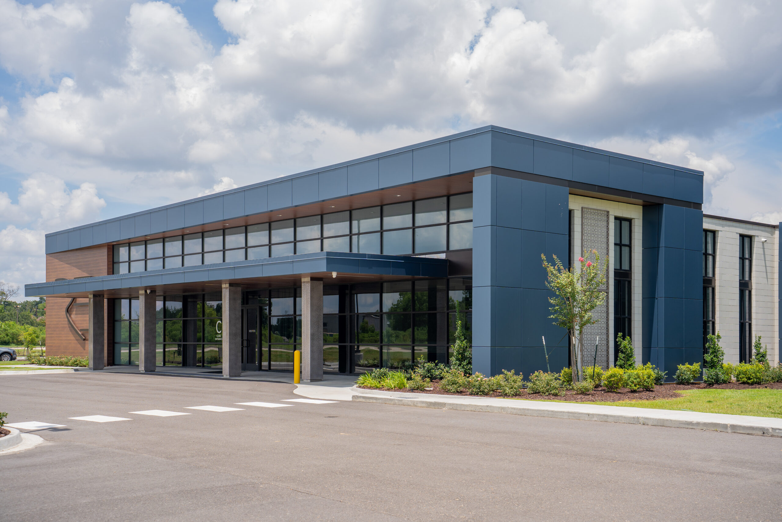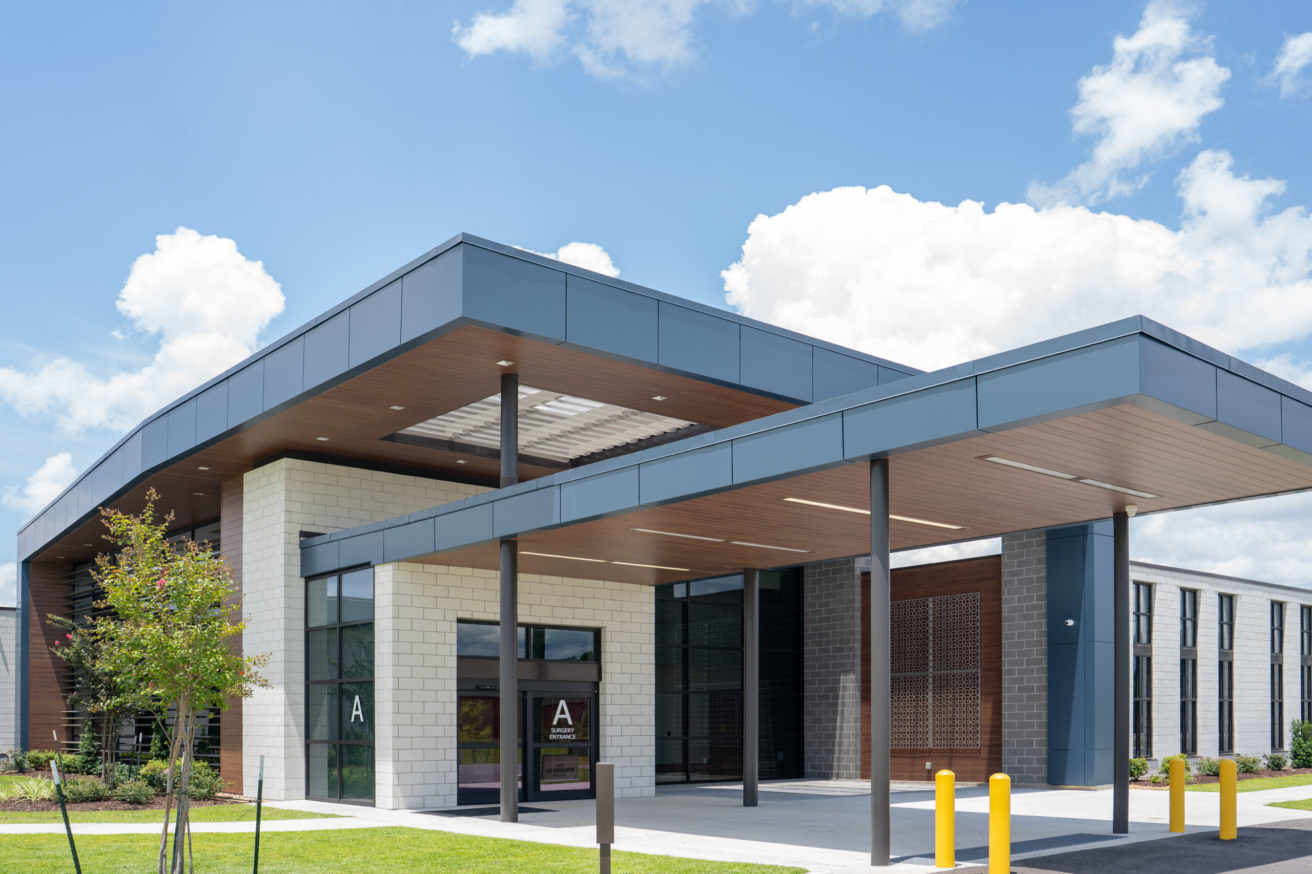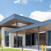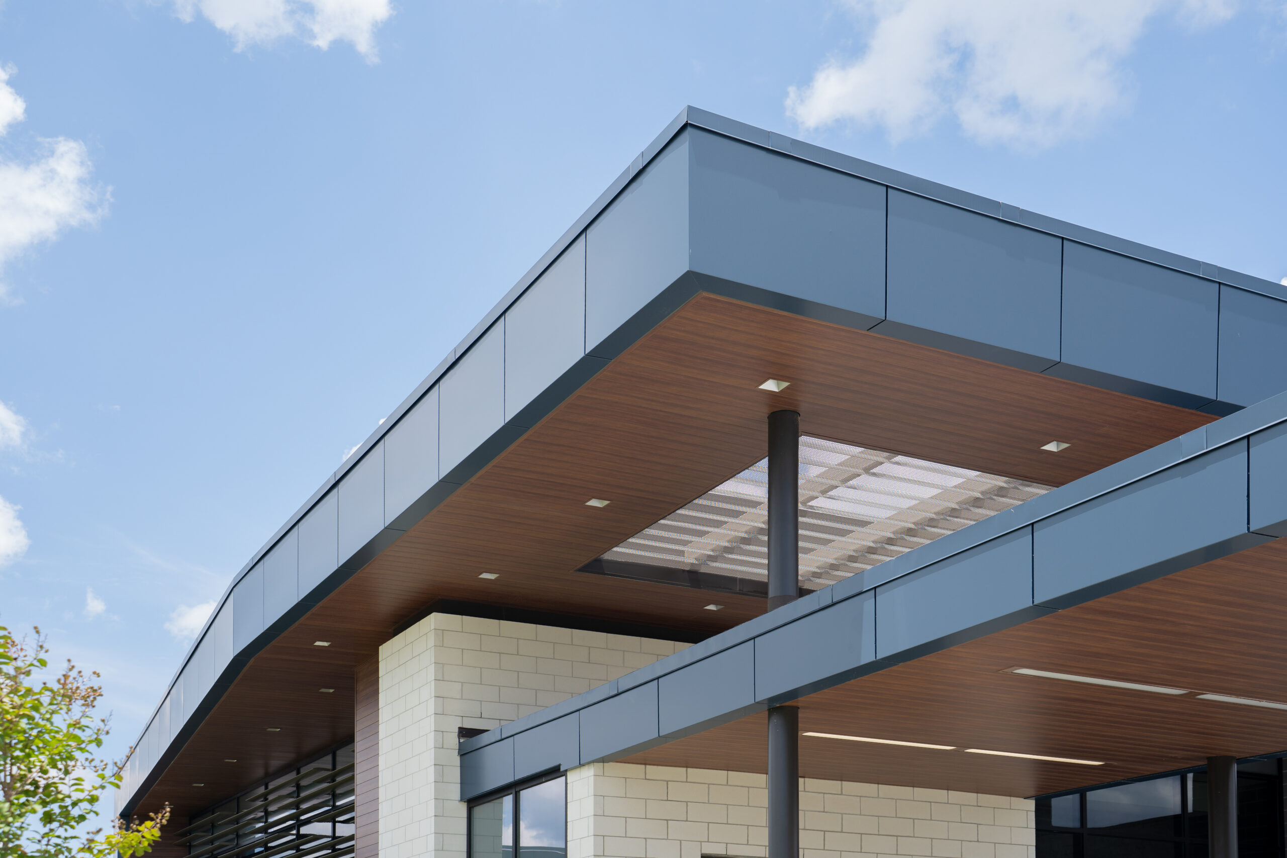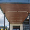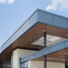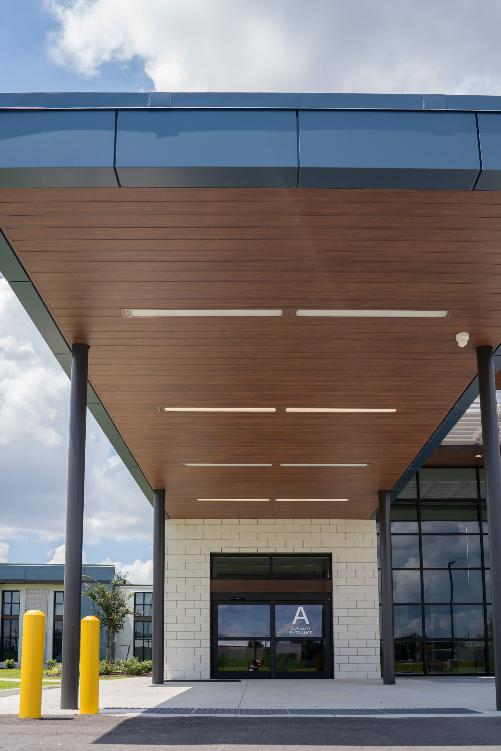 The Specialty Surgical Hospital in Louisiana, designed by Grace Herbert Curtis Architects, features Longboard’s 6″ V Groove Tongue & Groove planks in a Light National Walnut finish, seamlessly tying together the blue-grey panelling and white brick façade.