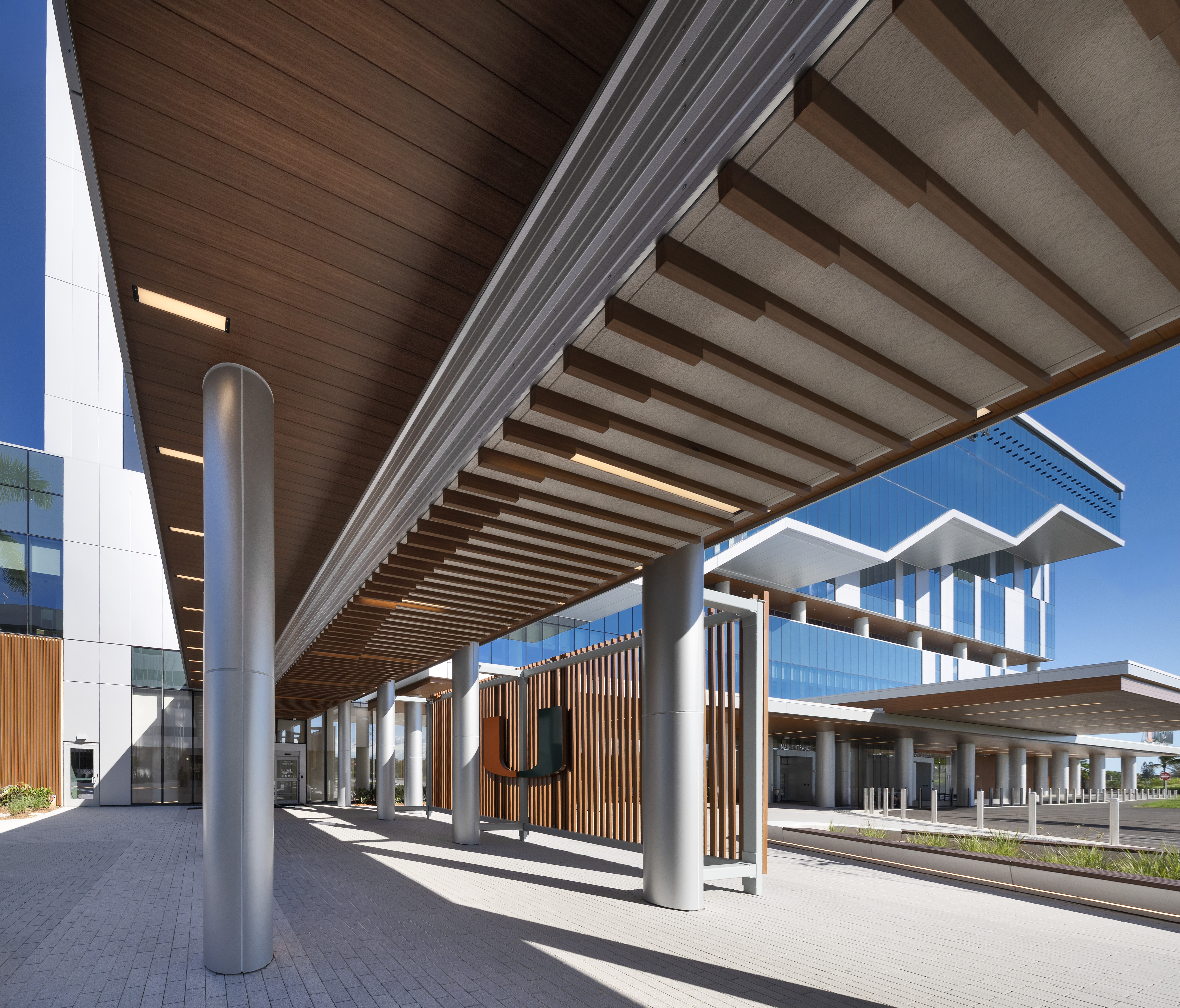 UHealth Solé Mia Medical Center, located in North Miami, brings world-class healthcare to the region. The structure beautifully ties together its glass and metal façade with Longboard’s Link & Lock system, featured on the exterior and soffits in a Blonde Oak finish.
