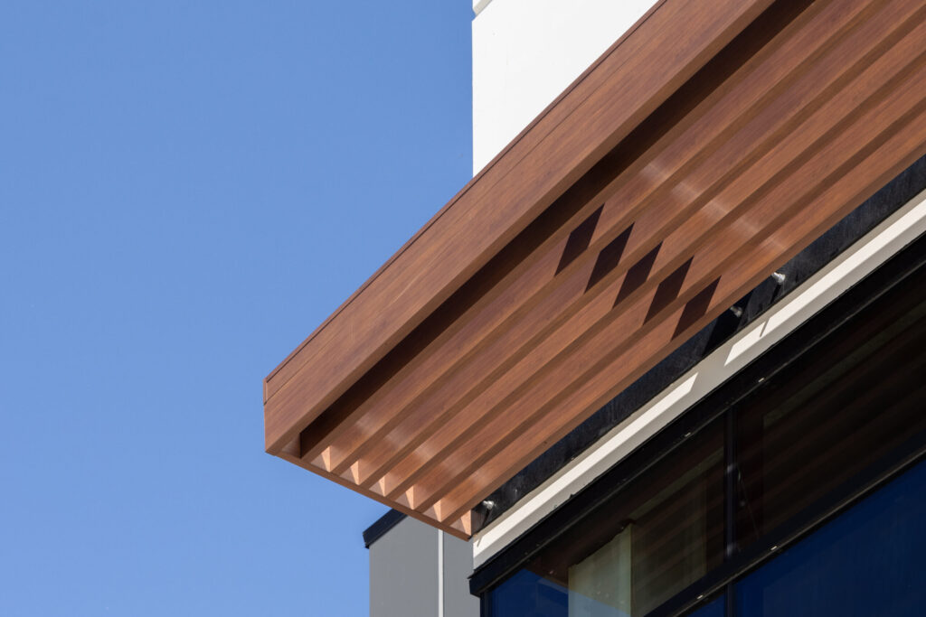 The next transition on the wall showcases the malleability of aluminum as the design shifts from panel board into a slanted soffit pertaining to aluminum’s flexibility and versatility makes a complex transition extremely straightforward to execute on site. The project concludes with board and batten installed vertically on a corner feature wall near the rooftop parking area, a system chosen to introduce visual depth and texture without additional framing.